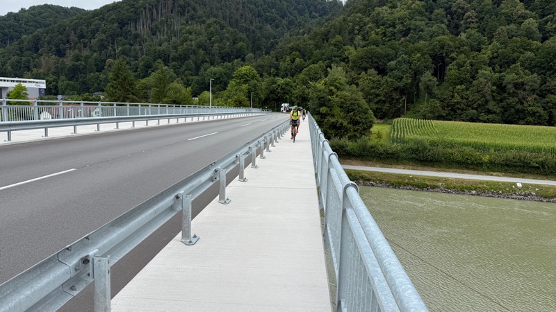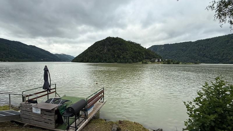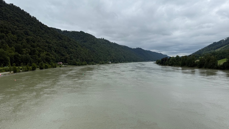 Sledilo je skoraj deset kilometrov osamljene vožnje v troje, nakar smo prečkali reko Ranno in v kraju Niederanna po moji zaslugi zgrešili odcep. Za nagrado smo kolesa nesli po strmih stopnicah do ceste, oziroma mostu čez Donavo. Pritožb ni bilo, jah, če ni klancev jih pač naredim. Na mostu smo pogledali nazaj gor proti Passau-u in naprej dol proti Linzu. Ker smo bili na pločniku smo kolesa preložili čez ograjo in še sami zlezli čez. Potem pa je Jerneja znova odneslo naprej, midva s Primožem pa sva hitela loviti zavetrje in bežala za njim. V lahnem drncu smo pridrveli v Schlögen an der Donau. Včasih so bili tu res vzorno prijazni, zdaj pa niti vode ne moreš odliti in priliti.