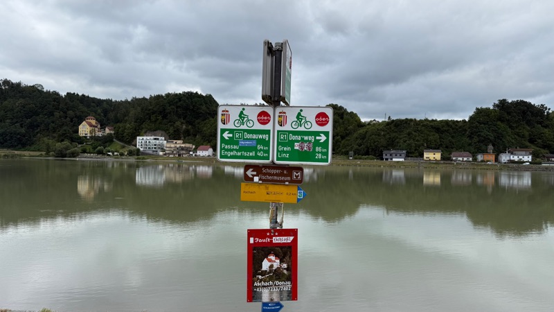 Tu pa smo vstopili v šlinge, meni najlepših petindvajset kilometrov zen vožnje ob Donavi, v senci dreves, kjer reka dela široke ogromne zavoje. Malce sem se potiho bal, da pot še ni urejena in da bomo šli čez obvoz poln klancev, tako kot me je doletelo nekaj let nazaj. No, pa so uredili, celo na novo asfaltirali tisti odsek kjer je bil kot kaže plaz tako, da smo še malce hitreje prišli v Aschach an der Donau in naredili kratko pavzo. Pogovarjal sem se s Čehom. Štirje očetje so peljali skoraj ducat svojih otrok s kolesi iz Passau-a do kampa pri Linzu, potem pa bodo skočili na vlak in se zapeljali proti nekemu kraju Tabor na Češkem. Prijeten in potrpežljiv možak, končno mi je nekdo potrdil, da je to kar sem videl na Vltavi pred leti res norija. Take gneče na reki in kot kaže še pijanih ljudi, si ne moreš predstavljati. Pomahal sem otrokom, mi pa smo nadaljevali še proti zadnjemu današnjemu delu.