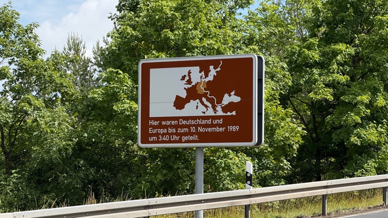 Ceste so postajale za kakšno stopnjo slabše, bolj naše, razlog pa je zelo zgodovinski. Bližal sem se in prečkal nekdanjo mejo med zahodno in vzhodno Nemčijo, torej Železno zaveso, oziroma mejo med Bavarsko in Turingijo. Kakšen zgodovinski geograf postajam, Vlasta in Dejak bi bila verjetno kar ponosna. Zadnjič sem jo videl, zanimivo, gospa so isti kot so bili, ko so me učili in je ta železna zavesa še krepko stala. Kaj bluzim, je že preveč sonca. Na znaku je pisalo, da so novembra leta 1990 podrli meje in združili obe Nemčiji. Spomnim se tega in sem še danes resnično vesel, da se je to zgodilo. Ta dogodek je bil povod ostalim dogodkom in združevanjem in danes se lahko vozim s kolesom po Evropi brez meja, brez kontrol, še celo večinoma imamo isti denar. To moramo spoštovati in vzdrževati. Torej tudi jaz na tem mestu izražam močan NE vojni!